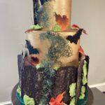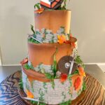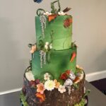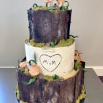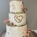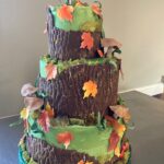 Woodland ( often contains upgrades) Description: This design contains a base tier done to resemble tree bark, which can be achieved with fondant OR buttercream frosting. The top tier is often frosted in a neutral color ( tan, green, or a combination of the two). The main components of this design include: flowers, butterflies, and curly grasses with mushrooms. Customization of this design is often done and will have some UPGRADED costs, depending upon the details incorporated.
