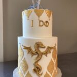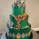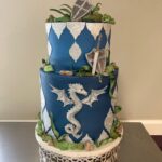 Dragon, Swords & Shields Description: This cake is comprised of a charcoal toned stucco and a color of your choice. Fondant cutouts are lustered with assorted pearls dusts. The main components of this design concept include: 1 Dragon with 2 Swords & Shields. Some curly grasses and edible rocks ar incorporated to round out this design.