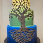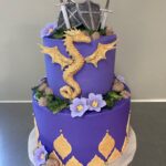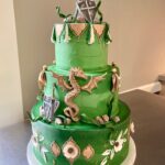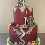 Swords & Shields Description: This cake is comprised of a dragon with 2 swords & Shields. The frosting can be done in a color of your choice (ombre is optional). The components of this design can include, fondant quatrefoil cutouts, or flower blossoms. Curly stems, edible rocks, or moss often add the finishing touch to this design.