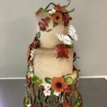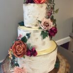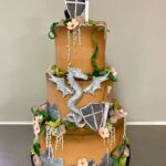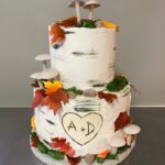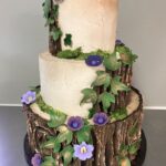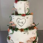Woodland Description: This design is one of the most detailed designs offered and can incur some upgrade costs (starting at $25). The base tier of this cake is frosted in buttercream to resemble a brown hardwood bark. The additional tiers will have varying degrees of edible bark on them, often frosted with an earthy neutral such as beige, creamy ivory, or green. Components of this design can include, flowers, fall leaves, ivy, curly stems, or mushrooms. The number of decorative accents to be incorporated will often incur some UPGRADE costs.
