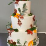 Seasonal Description: These cakes are generally frosted with a lightly textured buttercream and incorporate autumn leaves OR flowers as the main focus of the design. If you prefer to incorporate fresh or artificial flowers on your cake, please let me know, so we can plan accordingly. The cost of including sugar flowers with this will vary depending upon the type of flower and medium used to achieve it. Additional costs can be expected if we are doing palette knife flowers or extensive hand made gum paste components.